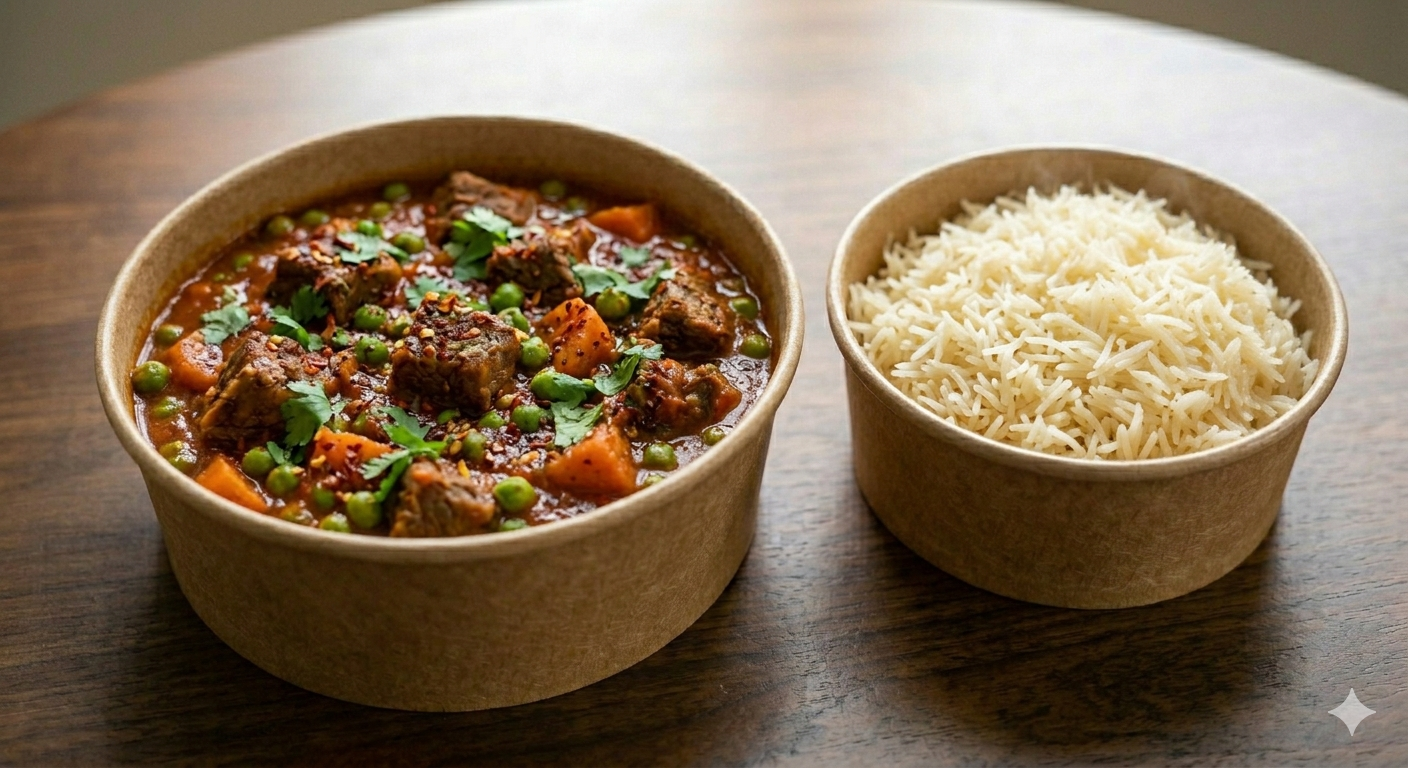 Tender beef pieces slow-simmered with green peas and carrots in a light, well-balanced tomato sauce, finished with a touch of butter for richness and pomegranate molasses for a perfectly sweet-tangy balance. Served with traditional vermicelli butter rice for a warm, comforting, and satisfying home-style meal. ✔️ Authentic home-style comfort food ✔️ Rich yet balanced flavor ✔️ Warm and filling ✔️ Family-friendly ✔️ Perfect for daily meal subscriptions